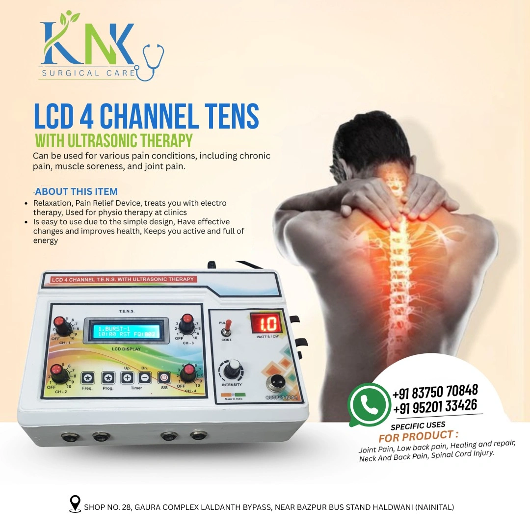 Experience advanced pain relief with our LCD 4 Channel TENS featuring Ultrasonic Therapy — combining precise electrotherapy and ultrasound technology to relieve muscle tension, accelerate healing, and improve patient recovery effectively.